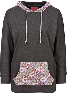 Un hanorac super trendy prevăzut cu glugă şi buzunar tip marsupiu cu imprimeu etno interesant. Model ultra relaxant cu o lungime de cca. 70 cm la măr. 40/42. Material superior: 60% bumbac, 40% poliester; Inserție material:: 60% bumbac, 35% poliester, 5% elastan