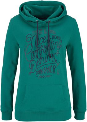 Cu glugă, imprimeu modern aplicat frontal şi buzunar tip marsupiu. Lungime de cca. 66 cm la măr. 40/42. Se spală la maşină.