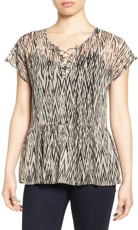 Lucky Brand Ikat Print Lace-Up Peplum Top BLACK MULTI