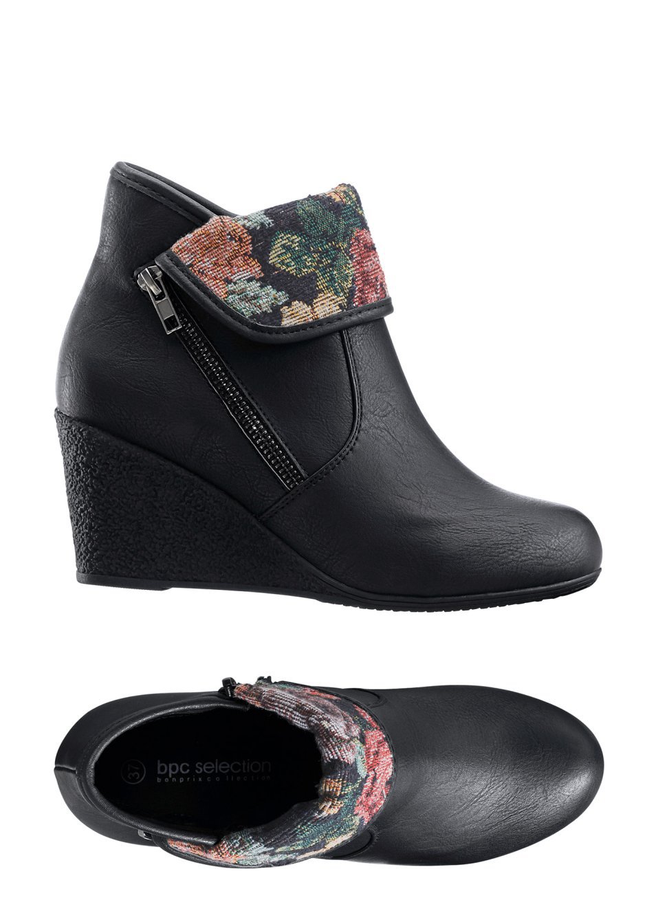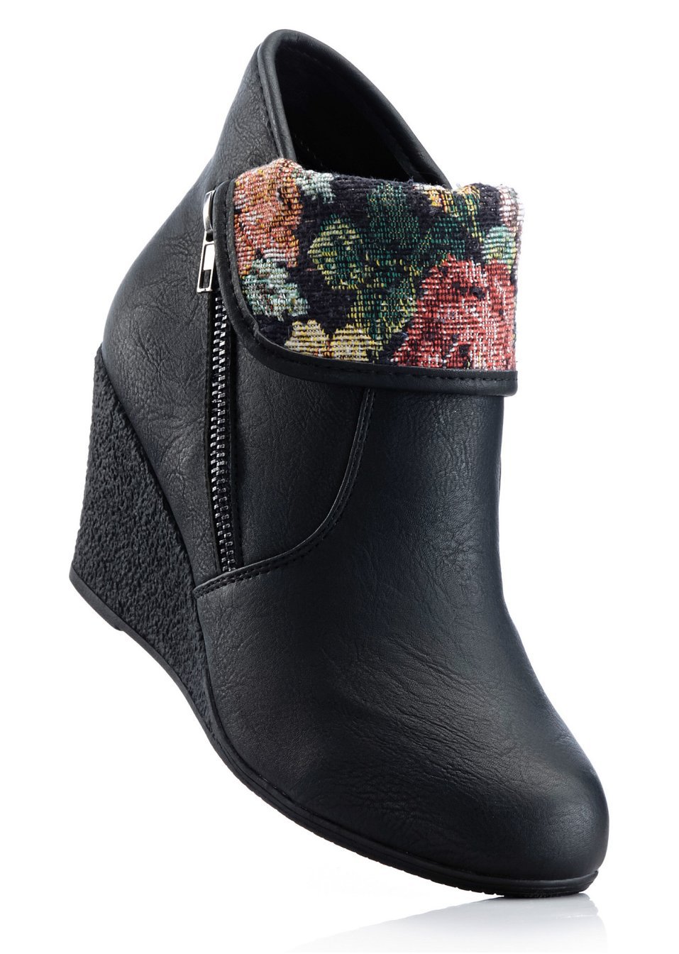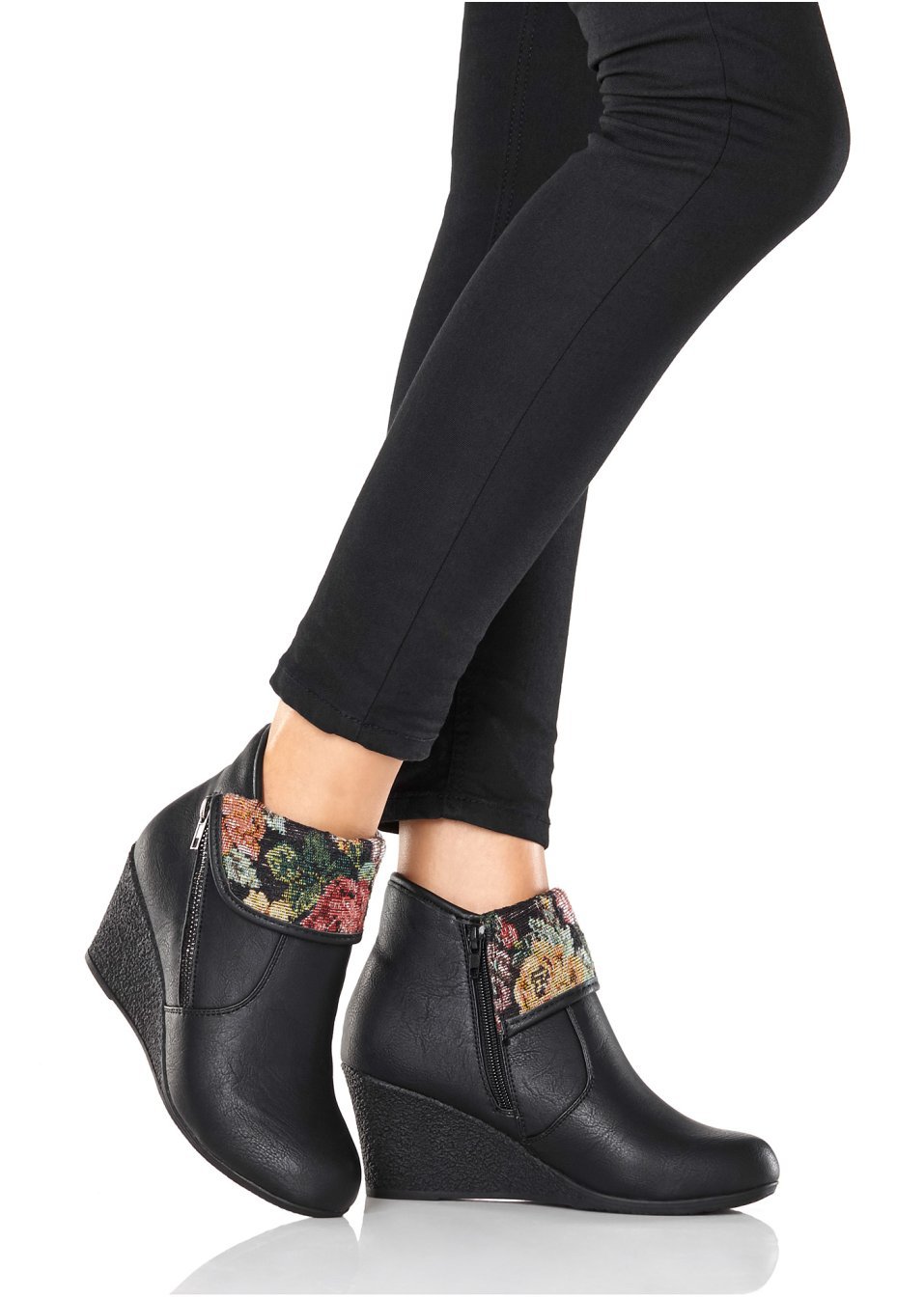 O pereche de botine feminine cu accente romantice de culoare, prevăzute cu toc ortopedic şi fermoar de încheiere. Material superior: imitaţie de piele; Talpă interioară: imitaţie de piele; Talpă: material sintetic