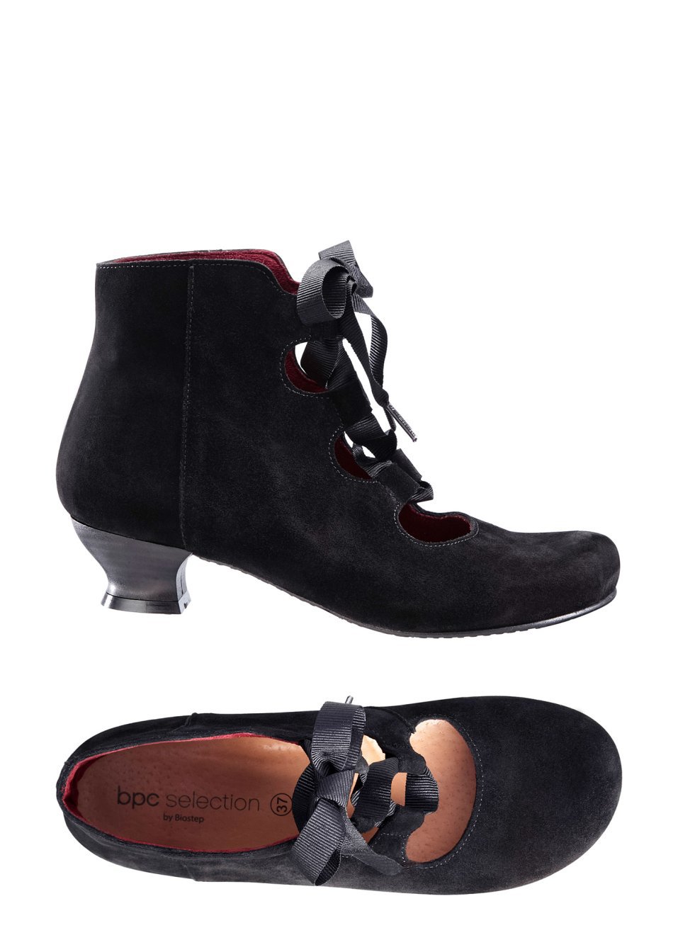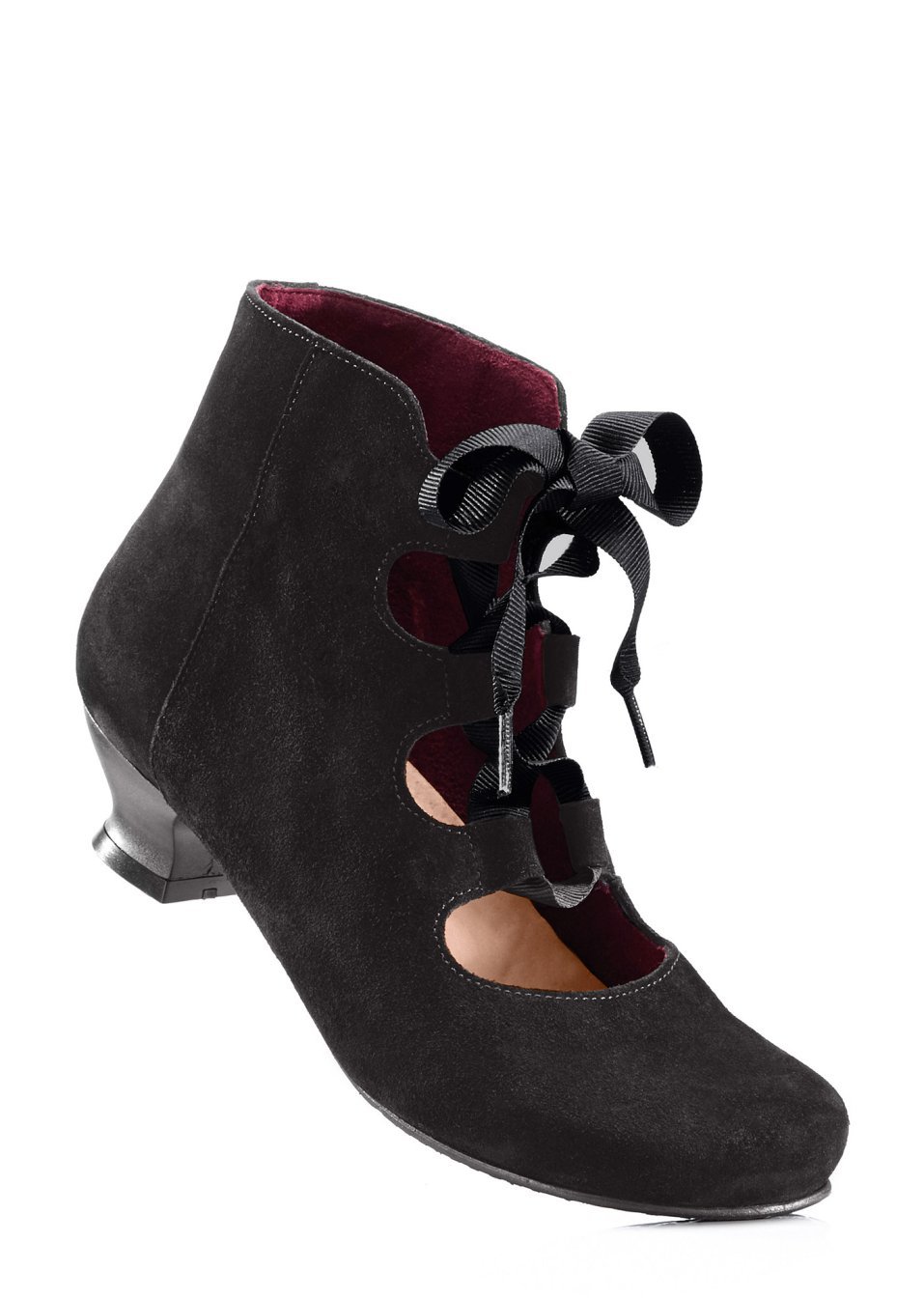 O pereche de botine absolut rafinată, cu un design aparte şi extrem de feminin. Model realizat din piele catifelată, foarte de calitate, prevăzut cu bentiţă satinată de înşiretare şi toc comod în stil baroc, înalt de 4 cm. Talpă interioară: piele; Material superior: piele întoarsă; Căptuşeală: piele; Talpă: material sintetic