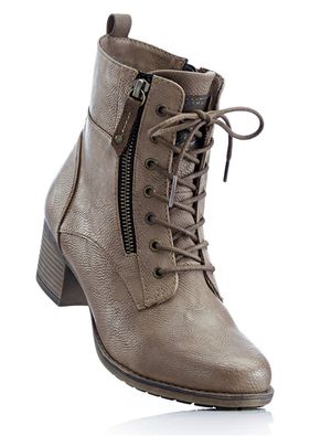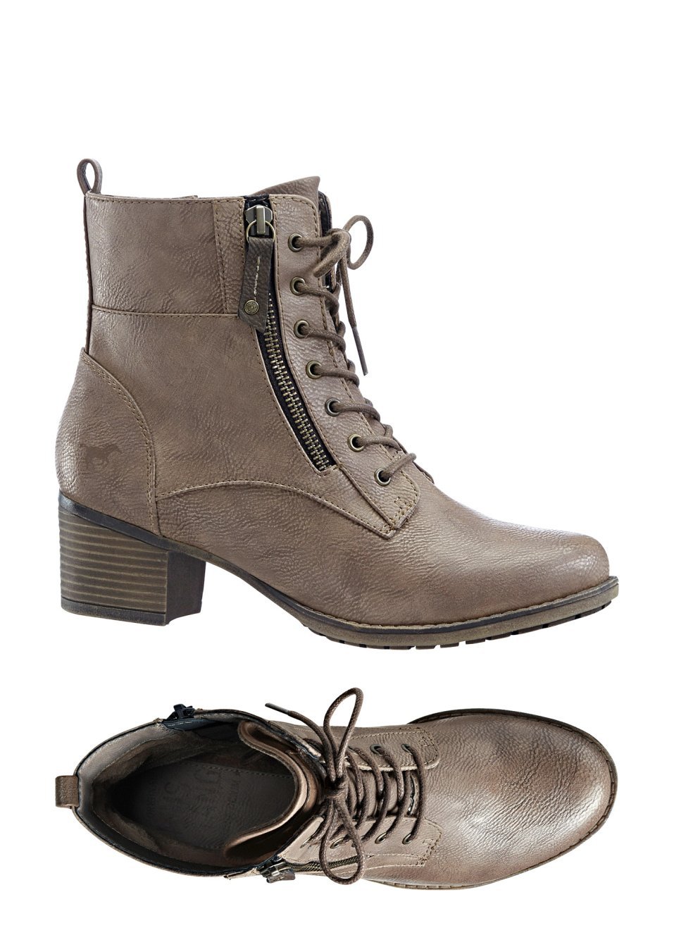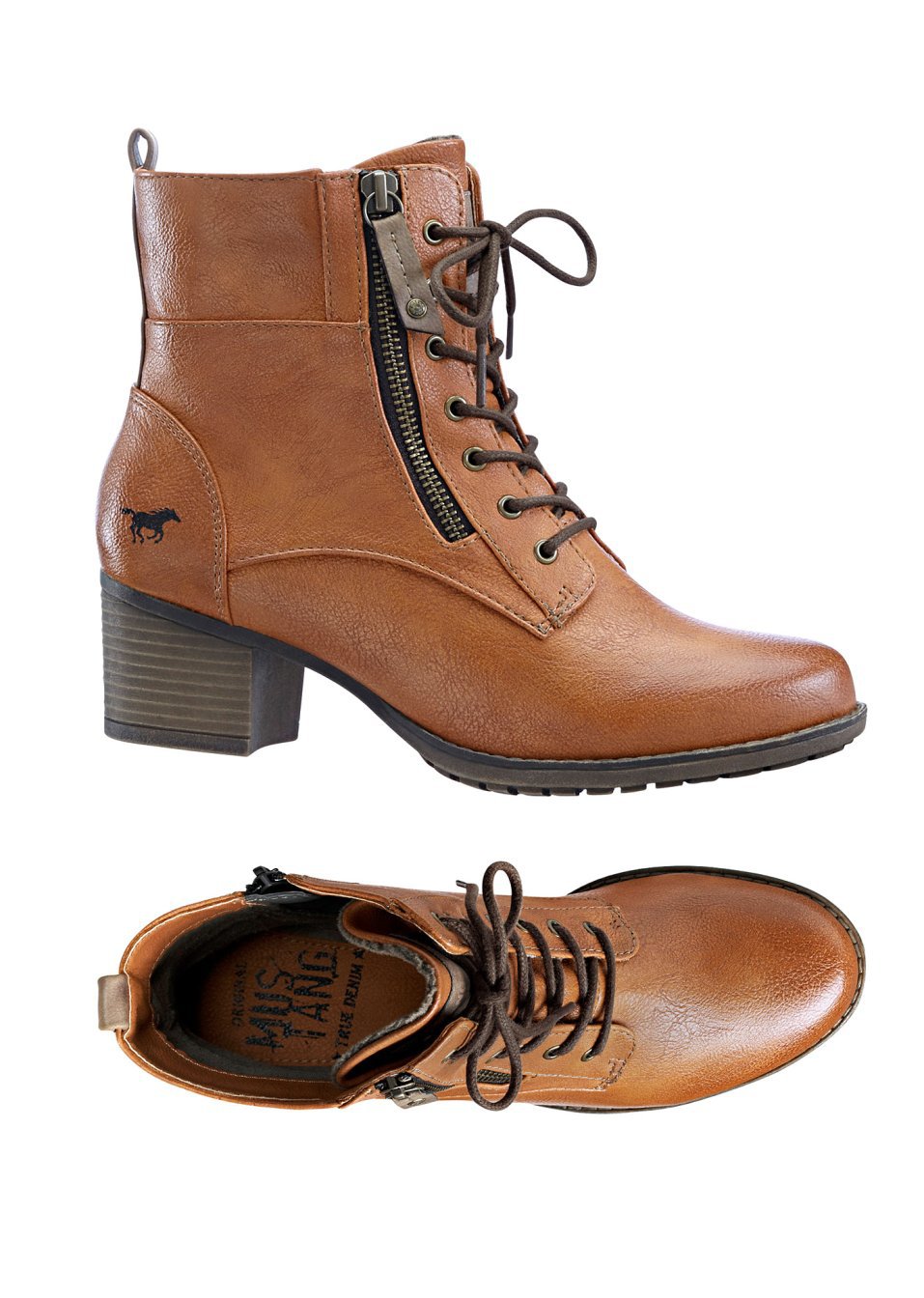 O pereche de cizme rafinate cu formă scurtă, marca Mustang, cu design super lejer şi trendy. Model prevăzut cu șireturi decorative, fermoar de încheiere prins pe interior şi toc robust, înalt de 5 cm. Material superior: imitaţie de piele; Talpă interioară: material sintetic; Talpă: material sintetic