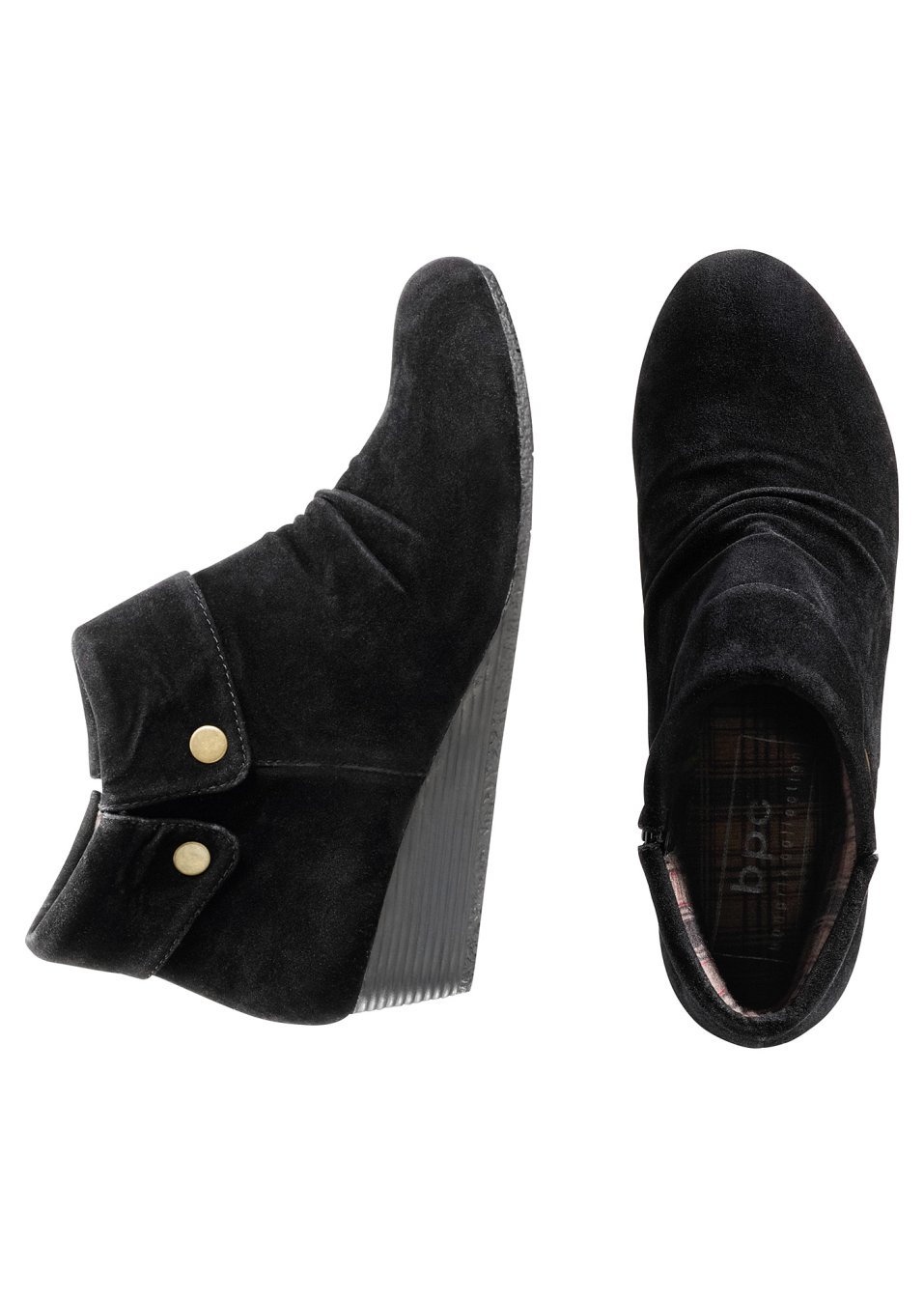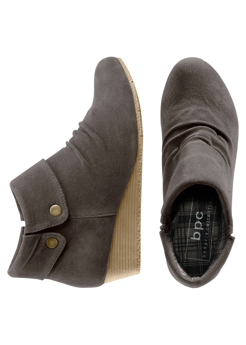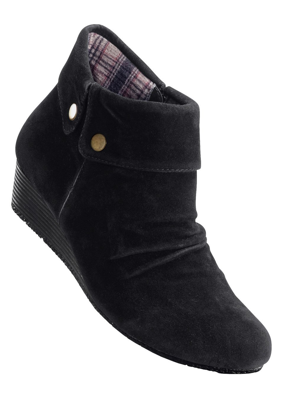 Cizmuliţe foarte moderne şi confortabile perfecte pentru ţinutele casual-şic. Model realizat din imitaţie de piele catifelată, prevăzut cu căptușeală interioară cadrilată, capse decorative, cute şic în faţă şi toc uşor ortopedic înalt de de 4 cm. Se potrivesc atât la o ținută cu fustă, cât și la una cu pantaloni. Material superior: imitaţie de piele întoarsă; Talpă interioară: material textil; Talpă: cauciuc