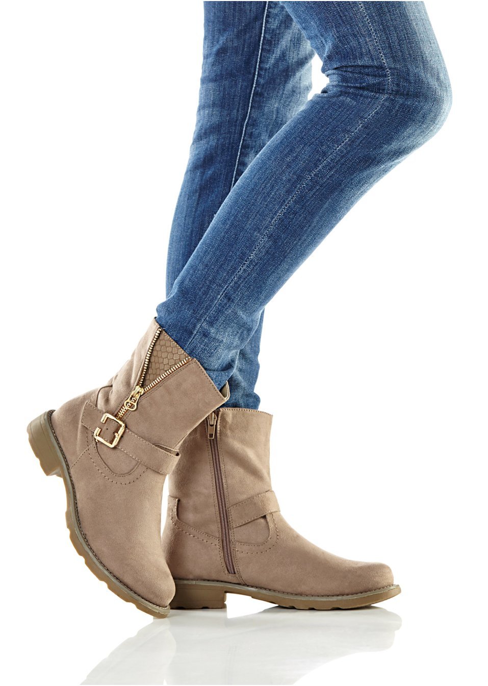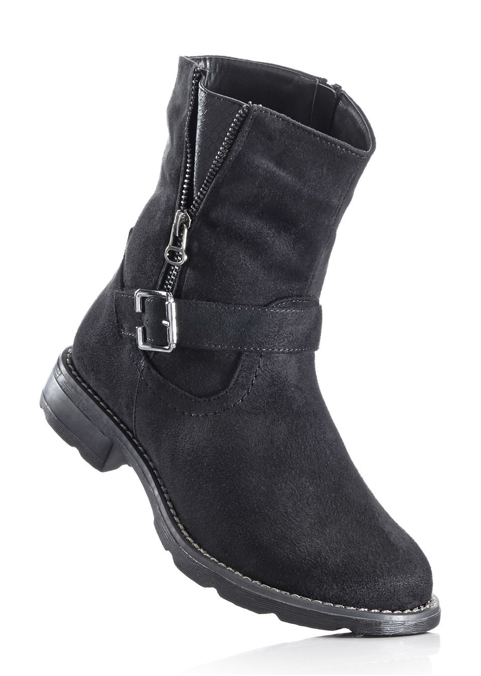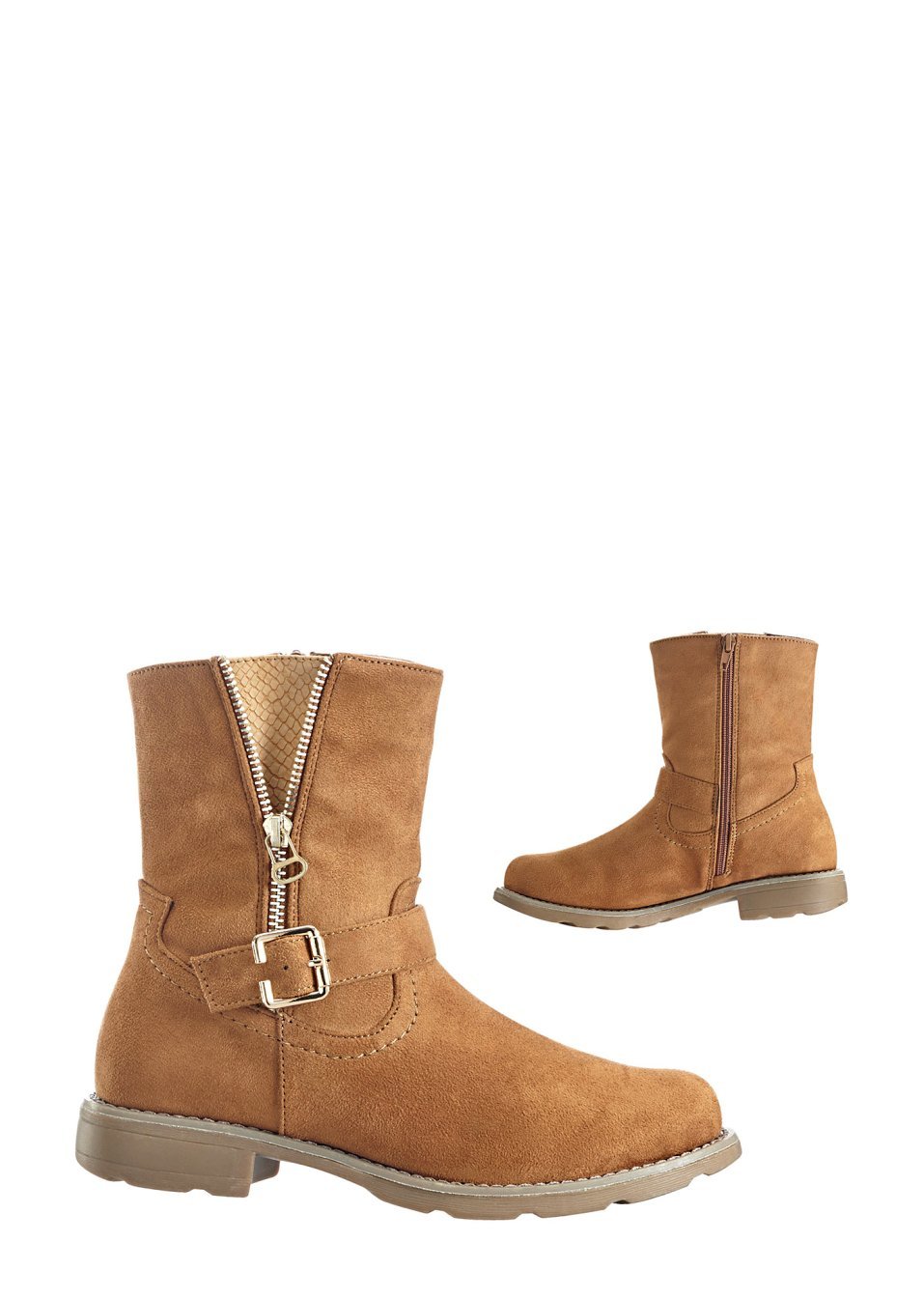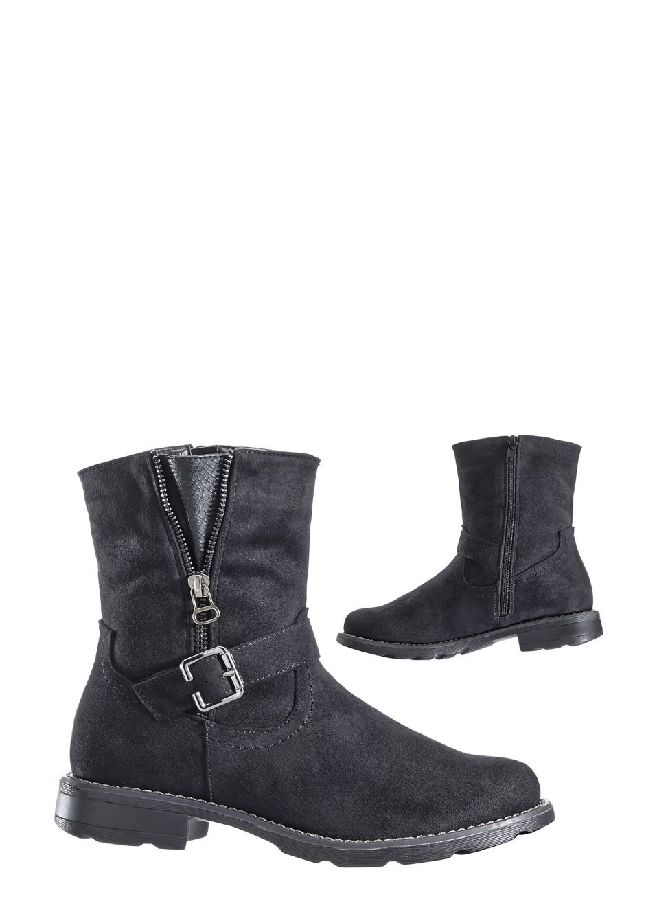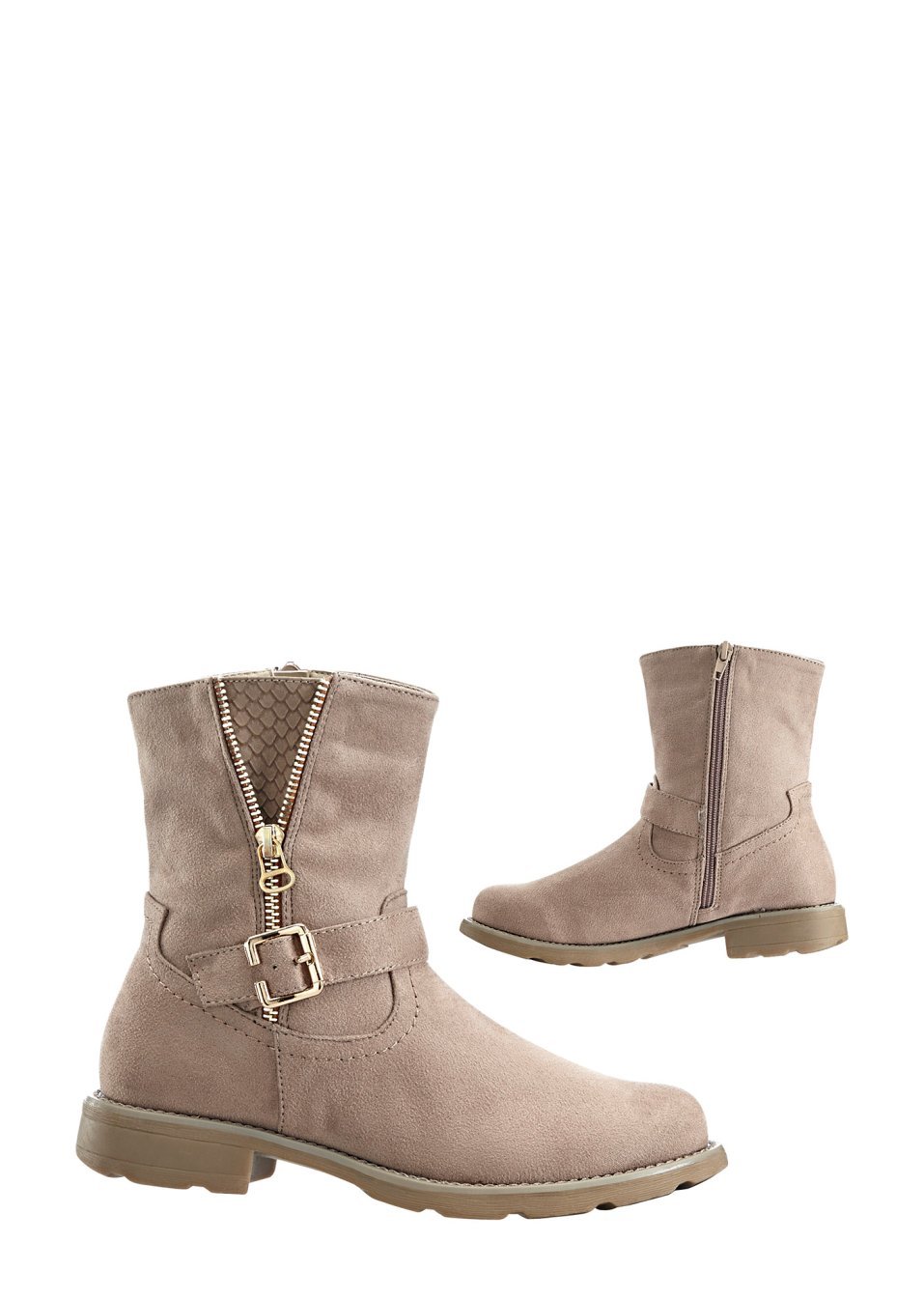 Robuste şi moderne, prevăzute cu fermoar şi toc de 2 cm. Material superior: imitaţie de piele întoarsă; Căptuşeală interioară: material textil; Talpă: material sintetic