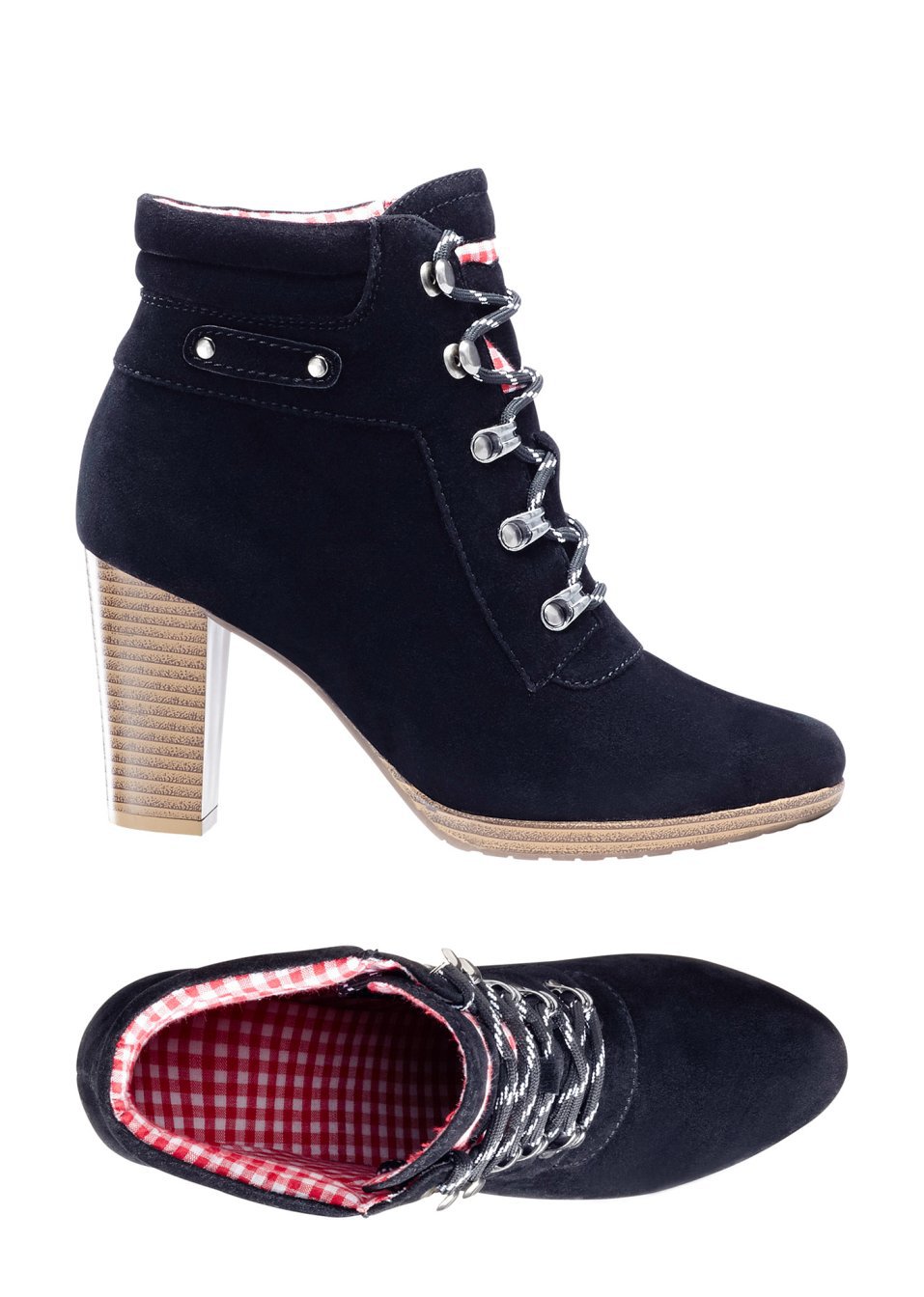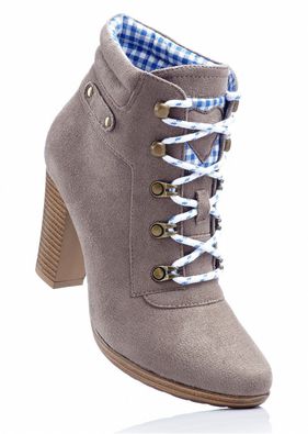 Cu șireturi, motive decorative, un model tipic Oktoberfest și căptușeală în carouri. Inimioară decorativă în partea de sus a carâmbului și un toc de cca. 9 cm. Material superior: imitaţie de piele întoarsă; Talpă interioară: material textil; Talpă: material sintetic