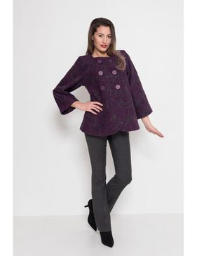 Jacheta neagra scurta cu o croiala evazata, lejera si maneca 3/4. Tesatura din lana prezinta un imprimeu grafic, in tonuri de gri pe fond mov. Se inchide la doua randuri de nasturi, cu buzunare pe fata si este captusita. Croiala la baza gatului. Compozitie: 70% lana, 30% poliester.