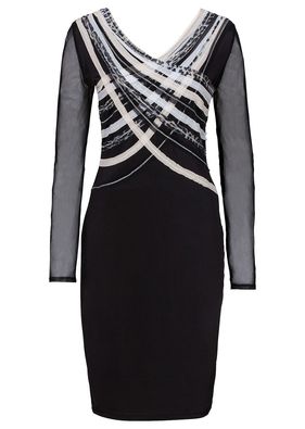 O rochie pur şi simplu adorabilă, cu formă dreaptă pe trup, rafinat ornată pe piepţi cu bentiţe de diverse culori şi imprimeuri, din material translucid, aplicate oblic şi suprapuse într-un mod original, fapt ce conferă unicitate fiecărei piese. Model realizat din material tip plasă cu căptuşeală delicată, prevăzut cu mâneci transparente, decolteu şic în V şi o lungime de cca. 106 cm la măr. 40/42. Material superior: 100% poliamidă; Căptuşeală: 100% poliester