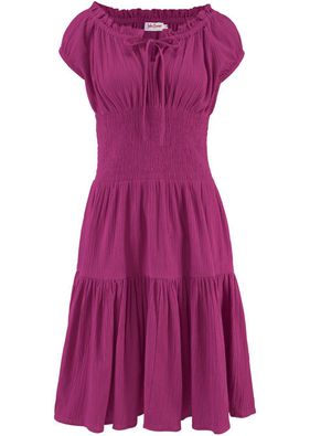 O rochie fermecător de feminină care pune şic accent pe talie prin croiul minunat cu inserţii elastice şi poala vaporoasă compusă din două volănașe alipite. Model lavabil prevăzut cu bentiţe de strângere la decolteu rotund şi cu o lungime de cca. 108 cm.