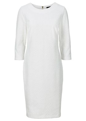 O rochie decentă, care se remarcă prin simplitate şi bun-gust, confecţionată dintr-un material interesant cu structură ornamentală rafinată, în relief. Model croit drept pe trup, prevăzut cu mâneci 3/4 comode, încheiere cu fermoar la spate şi o lungime de cca. 102 cm la măr. 42. Material superior: 77% bumbac, 23% poliester