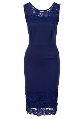 O rochie atractivă cu o croială simplă, frumos cambrată pe trup şi preţios agrementată cu dantelă florală tip Gipuir la nivelul plătcuţelor superioare şi în partea de jos a poalei. Model confecţionat dintr-un jerse stabil, prevăzut cu fermoar la spate şi cu o lungime de cca. 102 cm la măr. 42. Material superior: 100% poliester; Dantelă: 100% poliester