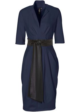Drapeuri rafinate! Rochie mulată cu decolteu adânc în V, mâneci 3/4, aspect petrecut și curea lată în zona taliei. Lungime la măr. 38 cca. 98 cm. Material superior: 70% vâscoză, 25% poliester, 5% elastan; Acoperire: 100% poliuretan; Accesoriu: 100% poliester