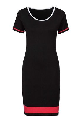 O rochie care emană o eleganţă simplă, prin croiul său drept pe trup, cu mâneci scurte şi decolteu rotund şi larg. Model frumos ornat cu dungi şic de contrast, prevăzut cu o lungime de cca. 96 cm la măr. 40/42. Material superior: 80% vâscoză, 20% poliamidă