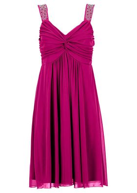 O rochie fermecătoare cu un model frumos realizat din şifon delicat, prevăzut cu decolteu în V, aspect cutat decorativ şi aplicaţii cu paiete drăguţe pe umeri. Lungime cca. 90 cm la măr. 36/38. Material superior: 100% poliester; Căptuşeală: 100% poliester