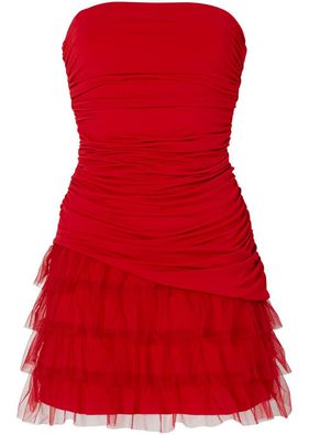 Cu partea de sus bandeau, încrețituri elastice pe părțile laterale şi volănașe decorative din tul. Rochia are o lungime de cca. 90 cm la măr. 36/38 şi poate fi spălată la maşină. Material superior: 92% poliester, 8% elastan; Plasă: 100% poliester