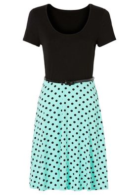 Rochie dulce realizată în stil city-chic, cu piepţii mulaţi şi confecţionaţi din material elastic de culoare uni şi cu poala evazată realizată dintr-un material fluid cu buline jucăuşe. Lungimea la măr. 36/38 este de cca. 90 cm.