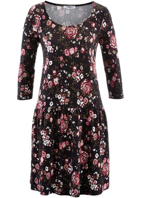 O nouă piesă adorabilă de la "bpc Collection" care poate fi folosită pentru obţinerea multor ţinute drăguţe. Rochie dulce cu formă feminină de A, lungime decentă şi mâneci lungi, realizată dintr-un material delicat şi elastic, cu un print floral fermecător pe fond închis. Model care ascunde isteţ problemele siluetei, prevăzut cu o lungime de la cca. 94 cm (măr.36/38) până la cca. 104 cm (măr.56/58). Fiecare piesă este un unicat. Material superior: 95% vâscoză, 5% elastan