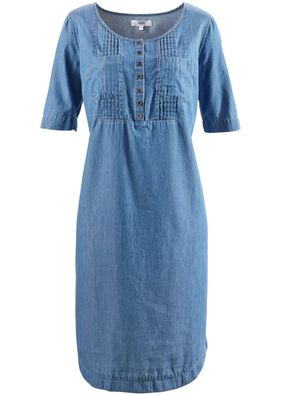 O rochie tinerească şi modernă confecţionată din blug fin, prevăzută cu cusături gen lamele în faţă, buzunare aplicate frontal şi poala feminin rotunjită. Model lavabil cu o lungime de la cca. 104 cm (măr.38) până la cca. 110 cm (măr.56). Material superior: 100% bumbac