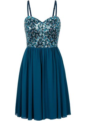 O piesă ultra feminină perfectă pentru o apariţie de vis! Rochie adorabilă cu piepţii finisaţi în partea de sus cu formă şic de "inimă" şi total acoperiţi cu paiete minunate. Model prevăzut cu breteluţe fine, poală bogat încreţită şi cu o lungime de cca. 90 cm la măr. 38. Material superior: 100% poliester; Căptuşeală: 100% poliester