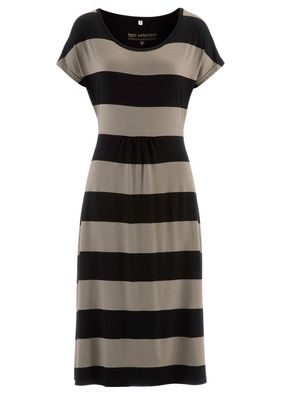 O rochie casual-şic realizată dintr-un tricot fin cu dungi late! Model prevăzut cu decolteu rotund şi mânecuţe largi. Rochia poate fi spălată la maşină şi are o lungime de la cca. 114 cm (măr.36/38) până la cca. 118 cm (măr.56/58). Material superior: 95% vâscoză, 5% elastan