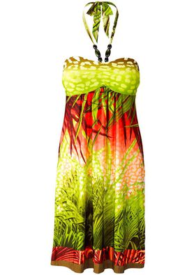 Dor de vacanţă! Rochie de vară minunată realizată din material uşor de tricot cu un imprimeu exotic deosebit şi breteluţe care se leagă la ceafă. Pe piept cu drapare frumoasă, iar la decolteu cu peluţe decorative. Lungime cca. 96 cm. Material superior: 5% elastan, 95% poliester