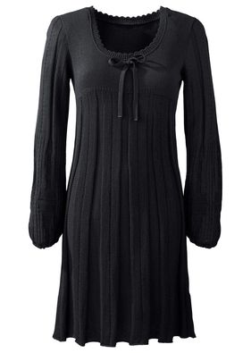 Rochie tricotată modernă, ornată cu o fundiţă şic la decolteul rotund. Model cu poala frumos evazată şi mânecile uşor largi şi strânse la capete. Lungimea la măr. 40/42 este de cca. 96 cm.